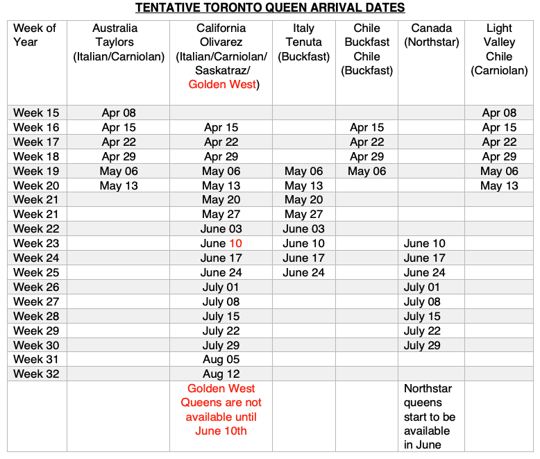 Queen shipments work on a calendar week schedule. For example, this means that you may purchase queens that will be delivered in week 21 (May 18-22, 2026). We may not know exactly which day of that week your queens will arrive until the week before (and sometimes not until the week of). We recognize this can make planning difficult but arrivals depend on when our partners book your queens to depart as well as on the airline schedule. While we make every effort to ensure that our schedule is up to date, there are sometimes flight delays that can impact the weekly delivery schedules.